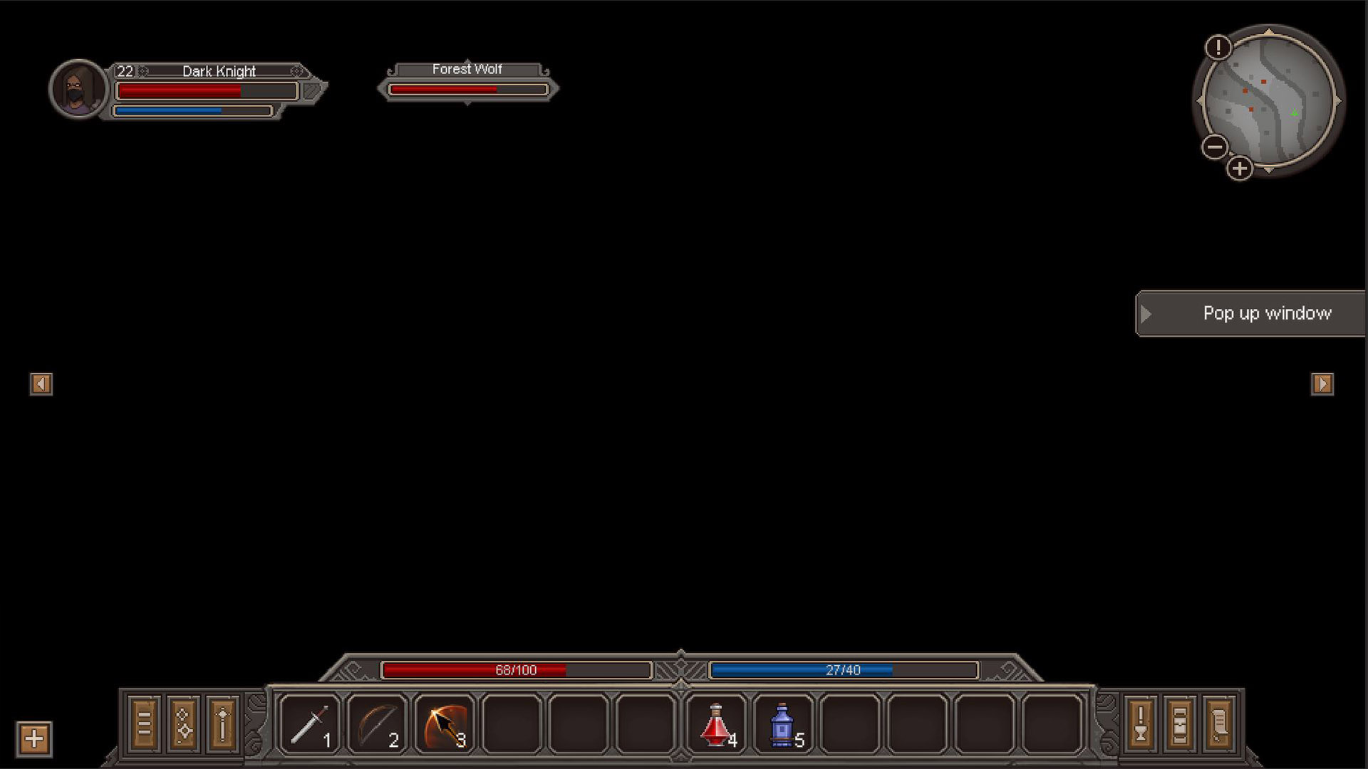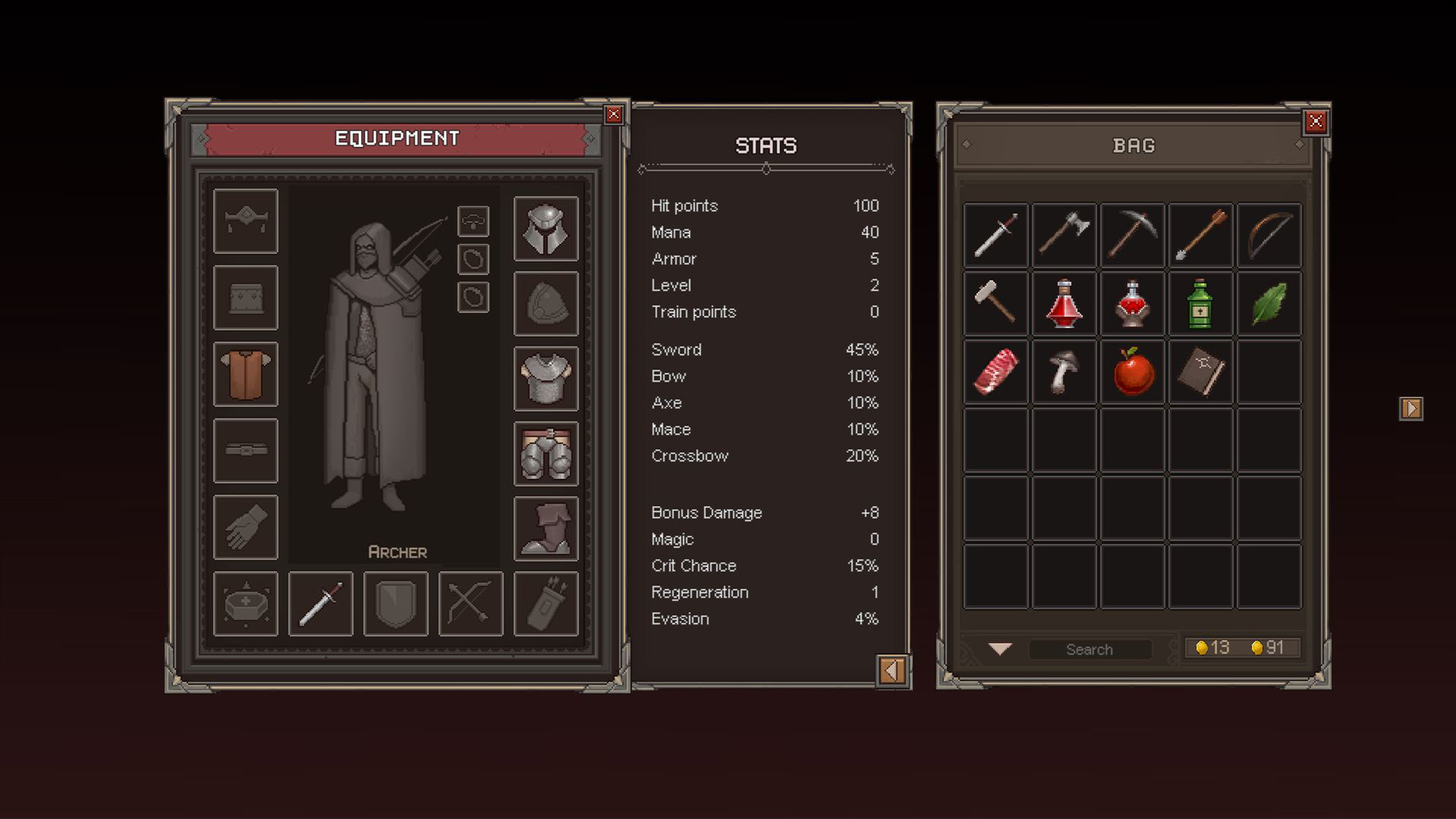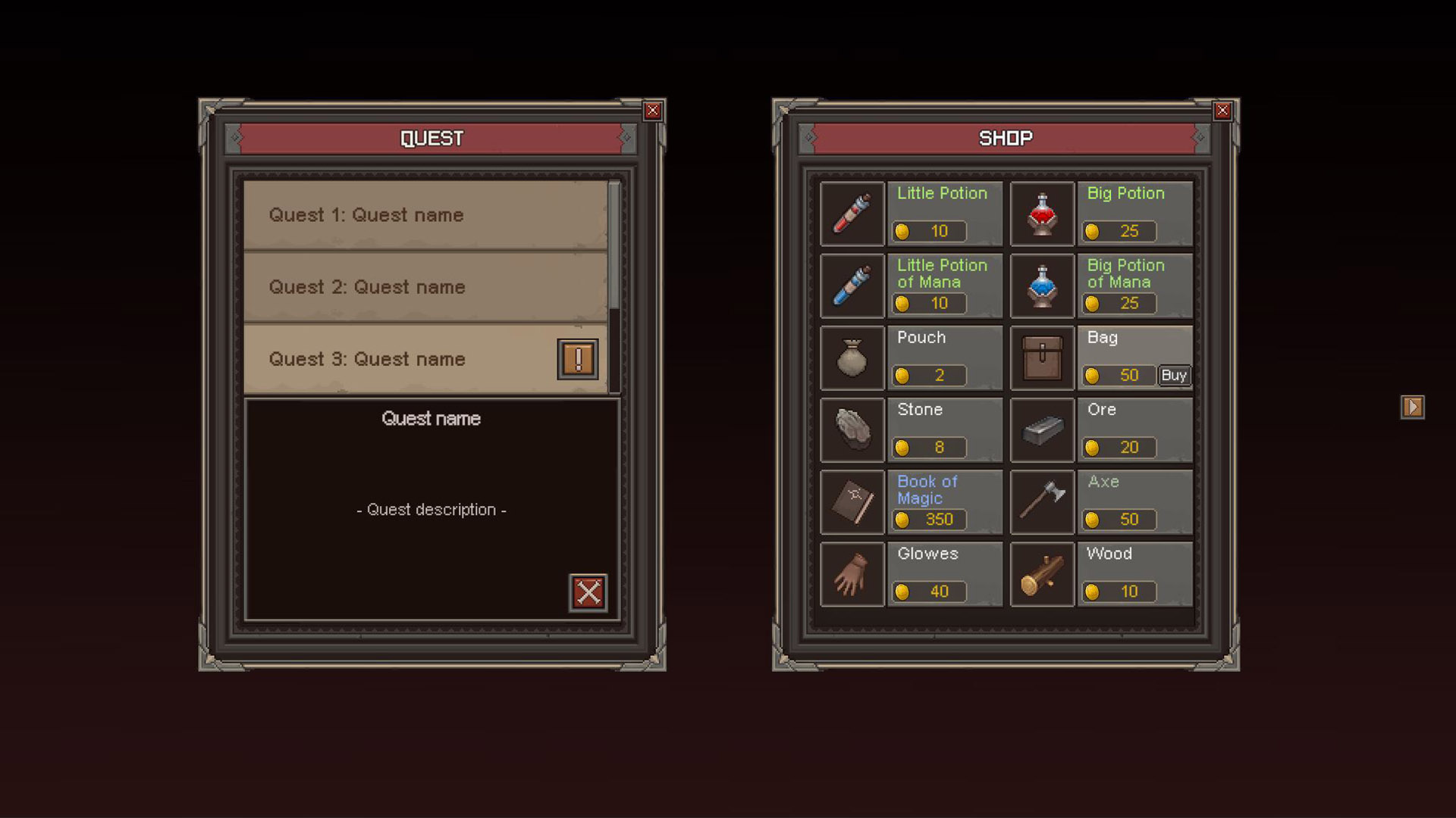 Classic pixelated interface for RPG or adventure games. Drawn in warm colors. There are also 2 interface options: classic and with flasks.